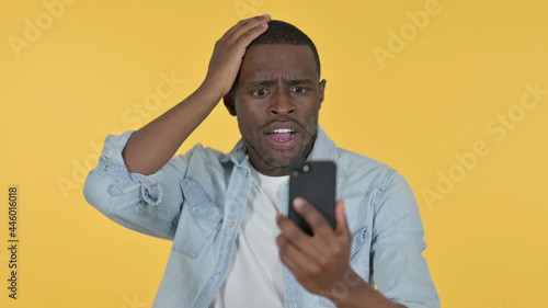 Young African Man Loss on Smartphone, Yellow Background
