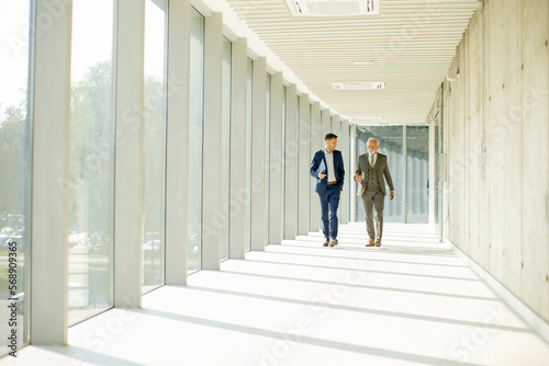 Young and a senior businessman walk down an office hallway, deep in conversation