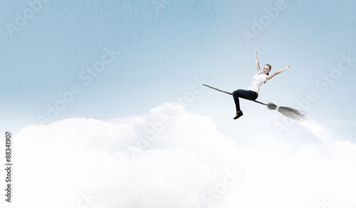 broom, flying, young, woman, student, break, girl, female, happy, careless, magic, smiling, sorcerer, beautiful, besom, fun, attractive, travel, ride, sitting, happiness, lifting, departure, soulfulness, freedom, hag, laughing, hovering