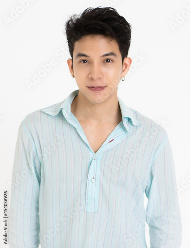 Young and handsome teenage black hair Asian man wearing earrings on white background