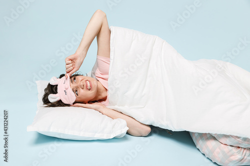 Young angry displeased sad woman in pajamas jam sleep eye mask rest relax at home lying lies wrap covered under blanket duvet pillow isolated on pastel blue background Bad mood night bedtime concept.