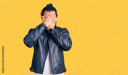Young arab man wearing casual leather jacket covering eyes and mouth with hands, surprised and shocked. hiding emotion