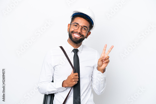 Young architect Brazilian man with helmet and holding blueprints isolated on white background smiling and showing victory sign