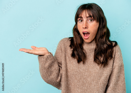Young Argentinian woman isolated on blue background impressed holding copy space on palm.