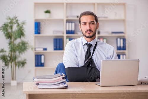 accident, accountant, arm, auditor, band, bandage, bandaged, bone, boss, broken, business, businessman, tied-up, car, care, computer, adviser, deadline, employee, fracture, fractured, gypsum, hand, injured, injury, insurance, laptop, leaves, man, manager, missing, office, pain, paperwork, recovering, recovery, rehab, rehabilitation, sick, sling, stressed, suffering, suit, work, workaholic, men at work, working, workload, workplace, young
