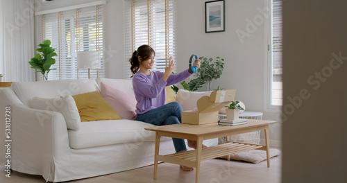 Young asia people happy teen girl influencer smile unbox open gift box enjoy buy order online store shop photo shooting camera show post social media app blog vlog share sit relax at home sofa couch.