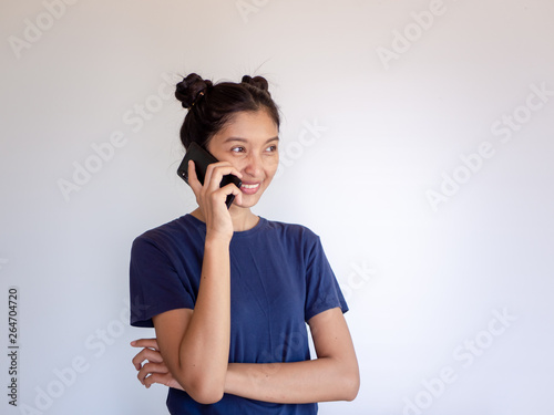 Young asia woman calling with cell telephone over white background