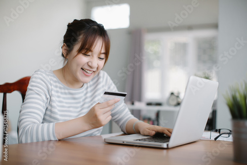 Young Asia woman holding credit card and using laptop computer.Online shopping concept