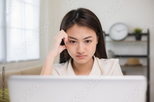 Young asian business woman hand touching head she's feeling depressed stress headache be tired from working with laptop a long time she symptom office syndrome.