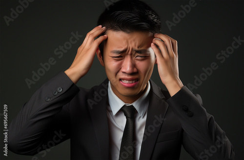 Young Asian Businessman in Discomfort, Stress, Pain in Head, Hands On Head