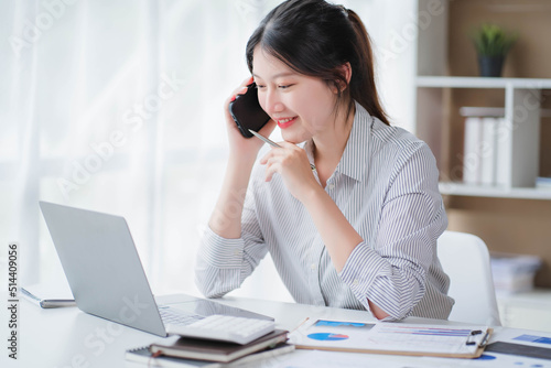 Young asian businesswoman beautiful charming smiling and talking on the mobile phone in the office