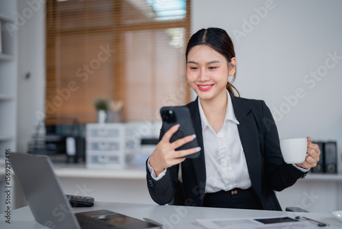 Young asian businesswoman drinking coffee and using smartphone while working with laptop in modern office, smiling female executive manager holding mobile phone and enjoying hot drink at workplace