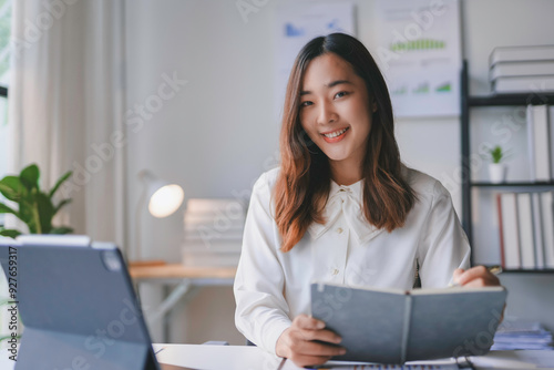 Young asian businesswoman is sitting at her desk, smiling and holding an open notebook