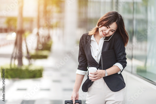 Young Asian businesswoman talking on phone and using tablet. Beautiful woman passenger has mobile call and discusses something with smile, holds coffee in hand
