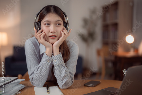 Young Asian businesswoman wearing over-ear headphones listening to music while resting her chin on her hands on a desk at home, taking a break from work with a laptop and a notepad in front of her