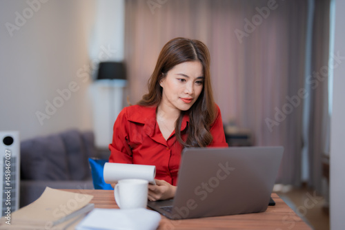 Young Asian businesswoman working from home checking receipts and invoices, managing domestic bills and expenses using laptop computer and drinking coffee