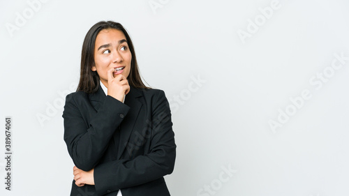 Young asian bussines woman isolated on white background relaxed thinking about something looking at a copy space.