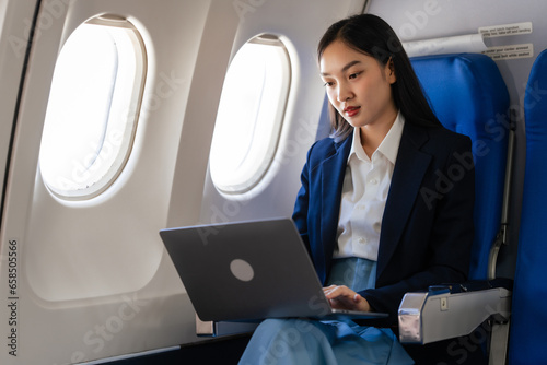 Young asian chinese japanese people female adventurer in-flight, mapping out destinations as she voyages worldwide. woman passenger of airplane. travel around the world.