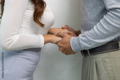 Young Asian couples happily express their love by hugging and holding hands to show their love and maintain trust. Sweet comfort touches the smiles of a newly married Asian couple.