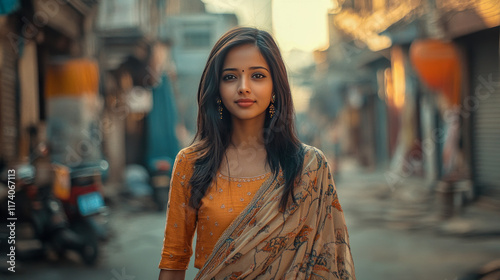 young, asian, female, traditional, street, sunset, saree, urban, fashion, cultural, attire, warm, expression, earring, ethnic, beautiful, serene, portrait, city, architecture, sunlight, building, relaxed, style, elegant, peaceful, calm, indian, picturesque, quiet, sidewalk, alley, journey, graceful, tranquil, dusk, soft, charming, clothing, heritage, lifestyle, outdoors, modern, classic, timeless, bustling, vibrant, daylight, background