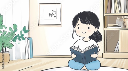 girl, reading, book, asian, cosy, home, interior, natural light, children, imagination, serene, decor, wooden floor, rug, plant, shelf, art, education, leisure, hobby, warm tones, peaceful, lifestyle, creative, inspiration, youthful, playful, happy, bright, comfort, relaxation, family, growth, exploration