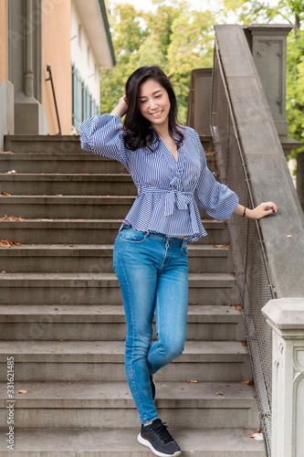 Young Asian Girl walking down stairs in Europe city. Europe city woman traveller lifestyle. Travel Europe summer holiday girl enjoying her holiday. Vacation and Holidays in Zurich and Europe concept.