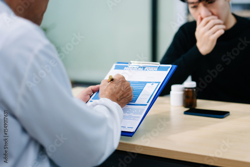 Young Asian man expressing concern in therapy session with psychiatrist. Mental health, stress, support, anxiety,
