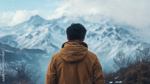Young Asian man gazing at snowy mountain landscape in solitude under dramatic sky