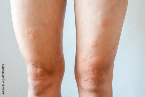 Young asian man has allergic skin rash on his legs from itchy dry skin eczema dermatitis insect bites