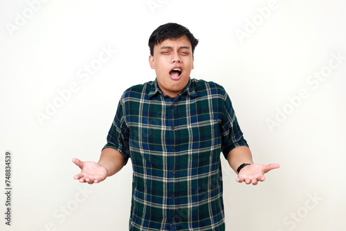 asian, indian, indonesia, indonesian, adult, young, man, male, guy, photogenic, isolated, white, background, casual attire, portrait, model, person, making, question, hand, gesture, confused, puzzled, face, expression, shrugging, know, anxious, mistake, problem, trouble, nervous, pensive, reaction, doubtful, hesitation, shoulder, open, mouth, closed, eye, negative, answer, asking, wondering, uncertain, ignorant, ambiguous