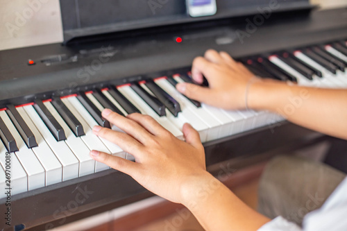 Young Asian man playing classical piano jazz music concert indoors relax time antidepressant music therapy concept