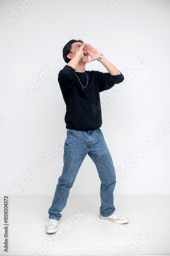 yelling, black shirt, jean, enthusiasm, shouting, full body, isolation, white background, casual clothes, expressing, urgency, looking up, young men, male model, communication, gesture, energetic, fashion, expression, standing, action, confidence, calling, posing, shout, excitement, people, portrait, dramatic, informal, vibrant, individual, solo, filipino, chinese, male, indonesian, thai, malaysian, guy, vietnamese