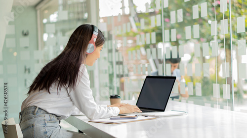 Young Asian students wearing headphones using their laptop in a coffee shop, writing notes on language learning, watching online webinars, audio listening courses, e-learning ideas.