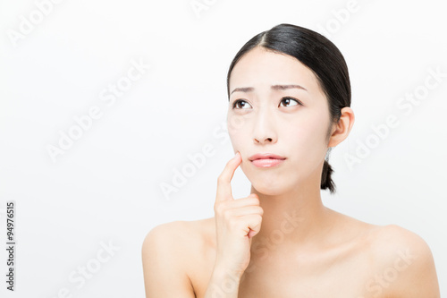 skincare, woman, people, acne, breakout, make-up, beauty, young, appealing, beauty, sweet, joyful, happy, fun, alone, natural, elegant, white, asian, japanese, chinese, waist up, cut-out, background