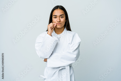 Young asian woman doing karate isolated on white background with fingers on lips keeping a secret.