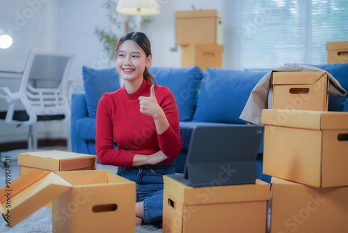 moving, house, home, woman, asian, box, new, apartment, box, cardboard, relocation, real, estate, property, mortgage, thumb, up, smiling, happy, sitting, floor, furniture, sofa, belonging, purchase, homeowner, ownership, domestic, lifestyle, interior, room, cheerful, thumb, success, positive, satisfied, content, recommend, approval, like, good, great