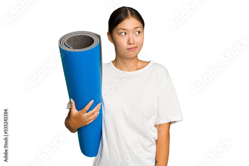Young asian woman holding a mat isolated on green chroma background confused, feels doubtful and unsure.