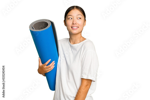 Young asian woman holding a mat isolated on green chroma background looks aside smiling, cheerful and pleasant.