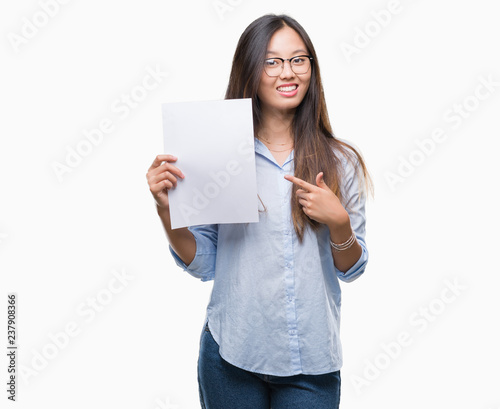 Young asian woman holding blank paper over isolated background very happy pointing with hand and finger