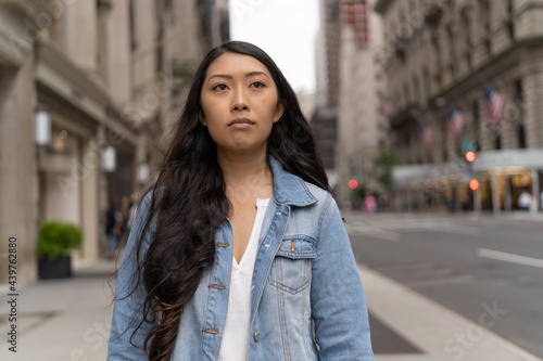 young, asian, woman, walking, serious, face, street, city, urban, thinking, sad, angry, new york city, cloudy, korean, japanese, chinese, long hair, 20s, casual attire, cute, female, girl