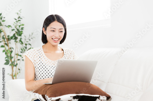 personal computer, notebook, woman, people, smile, lifestyle, couch, seated, cushion, mobile, cyberspace, alone, beauty, young, clean, appealing, bob, relax, japanese, chinese, asian