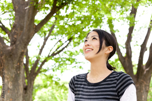 woman, young, alone, smile, casual, people, forest, forest, grove, park, open air, open air, green, nature, wood, verdure, outdoors, relax, vacation, leisure, lifestyle, live, happy, fun, look up, hope, future, dream, beauty, beauty, lovely, pretty, appealing, asian, japanese, chinese, spring, summer, season