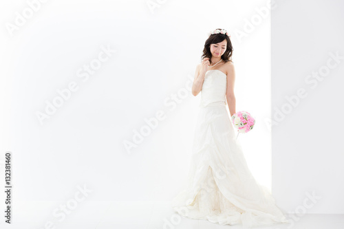 woman, people, bridal gown, marriage, wedding, bride, bride, whiteness, corolla, crown, bouquet, bouquet, dress, smile, portrait, beauty, young, white, alone, background, cut-out, background, japanese, asian