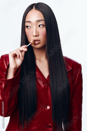 Young Asian woman with long black hair and red jacket smoking a cigarette outdoors