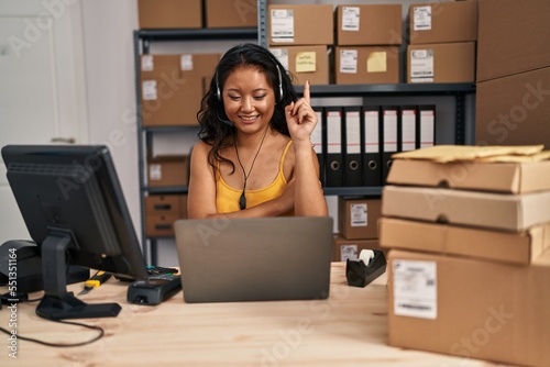 Young asian woman working at small business ecommerce wearing headset smiling happy pointing with hand and finger to the side