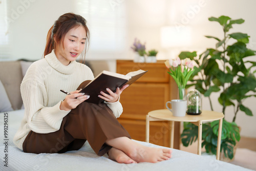 Young asian women in sweater reading the book to learning about knowledge and education while sitting on couch to relaxation and doing activity for spending time with slow life lifestyle at home
