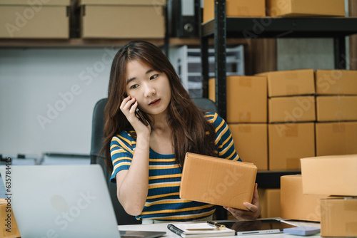 young asian women using smartphone contacted a customer asking for a shipping address.