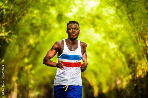 young athletic and attractive black African American runner man doing running workout training outdoors on urban city park in fitness sport and wellness