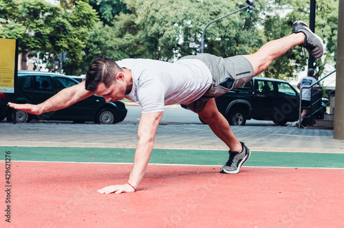 Young, athletic Latino male doing muscular exercise in the open air.