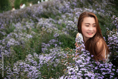 young attractive beautiful happy asian woman with white dress and soft touch purple aster margaret flower field, Travel lifestyle concept in winter.Travel and Lifestyle Concept.